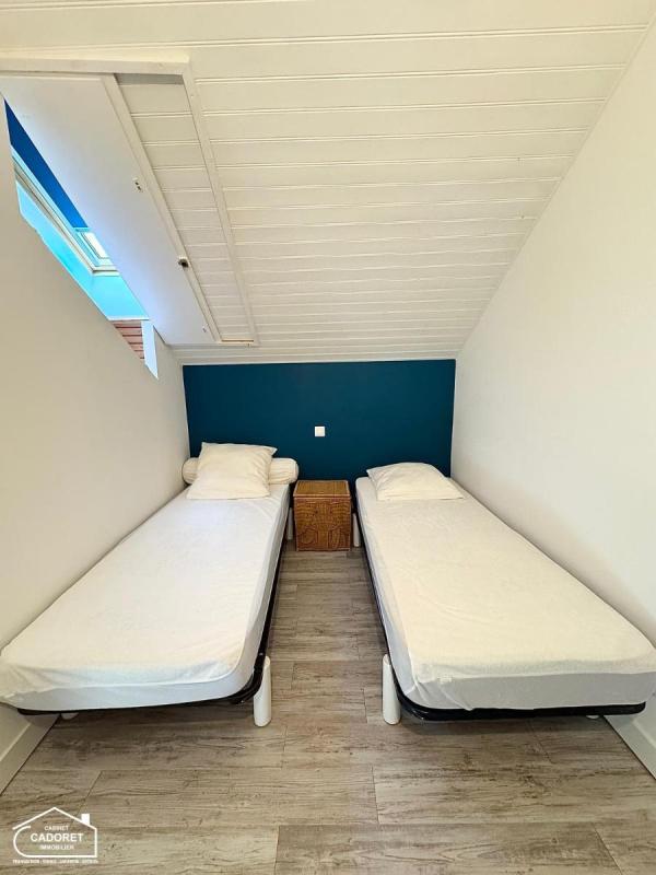Appartement T3 46m² St Michel 300m de la plage – Le cabinet CADORET Immobilier, vous propose en exclusivité, un appartement de 38m² loi Carrez et 46m² au sol, en rez-de-jardin, comprenant, une entrée sur la pièce principale, cuisine aménagée et équipée (four plaque, hotte) et emplacement pour le lave-vaisselle. Un dégagement avec placard aménagés, salle d’eau et WC. A l’étage 2 chambres. Jardinet avec terrasse à jouissance privative.